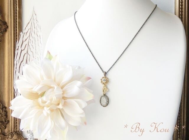 アンティーク感漂う古美色のチェーンでぐっとクラシカル感をプラスしてテール先端まで愛らしく、どことなく懐かしい胸の奥が温かくなるようなヴィンテージネックレスに仕上がっております。